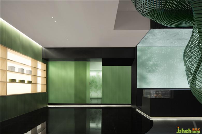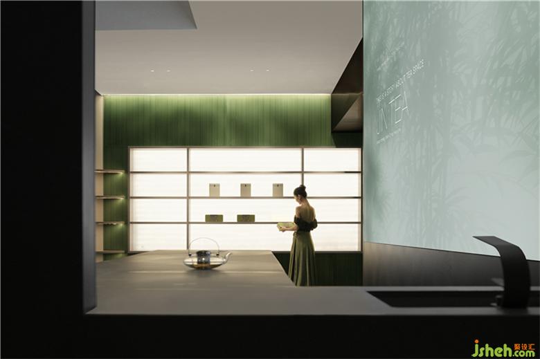 途经一片竹影,从喧嚣过度到宁静,空间被大面积的硬质仿竹装置围绕,形成一个幽深的造景方式。拥有“置入感”的装置设计横向连纹勾勒出竹林延绵之美,褪去浓重色彩,现代雅致融入景中,同时具备隐藏并集成了各项功能,包括开放式空间的遮蔽式区域、产品展示、存储和照明等。提升了立体感的同时,艾洛设计让竹影摇曳的画面更加真实,产生一步一景的“错觉”,让人从进门的一刻开始,感受到传统文化的流动生机、气韵生发。