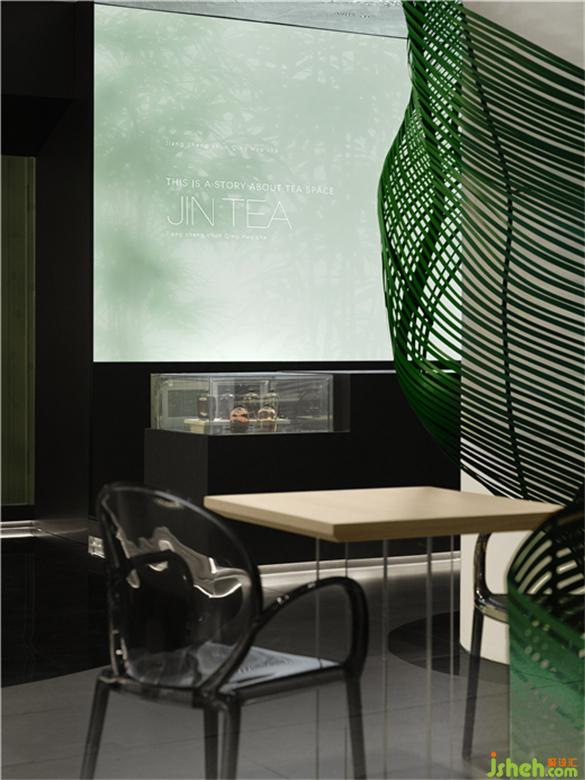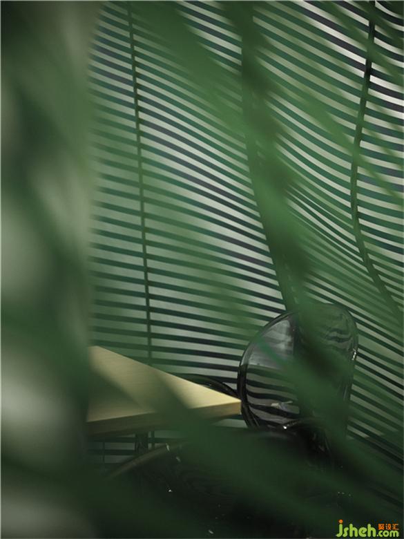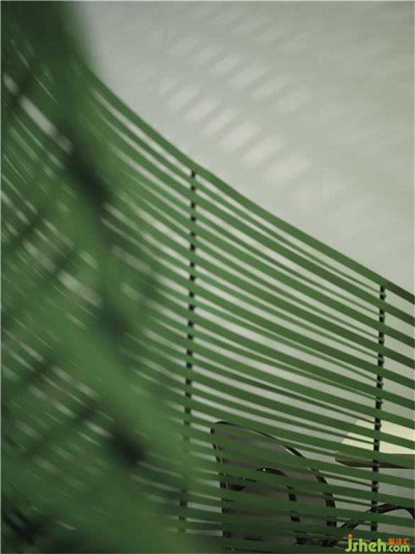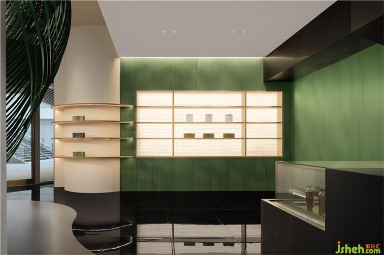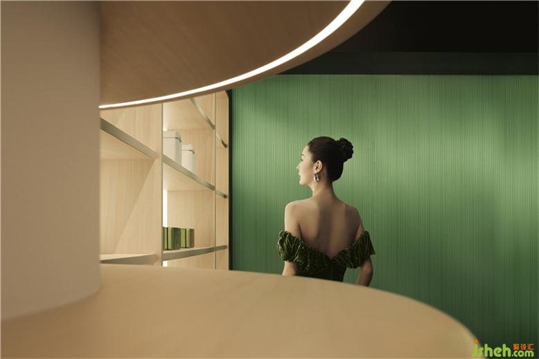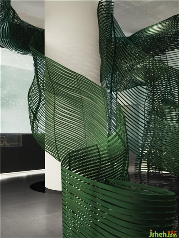 简单的带状仿叶轮廓营造出静谧的氛围,柔和蜿蜒的曲线给观者无限遐想,与空间内大量运用的渐变绿色灯光一起营造出虚实之间极简的美感。