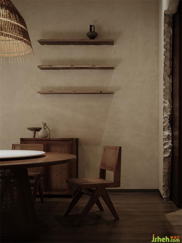 沿着向上生长的楼梯向二层空间探寻,开敞的就餐氛围逐渐变得更加隐私静谧。二层空间延续了一层自然质朴的空间基调,并在此之上做了更丰富的细节处理。