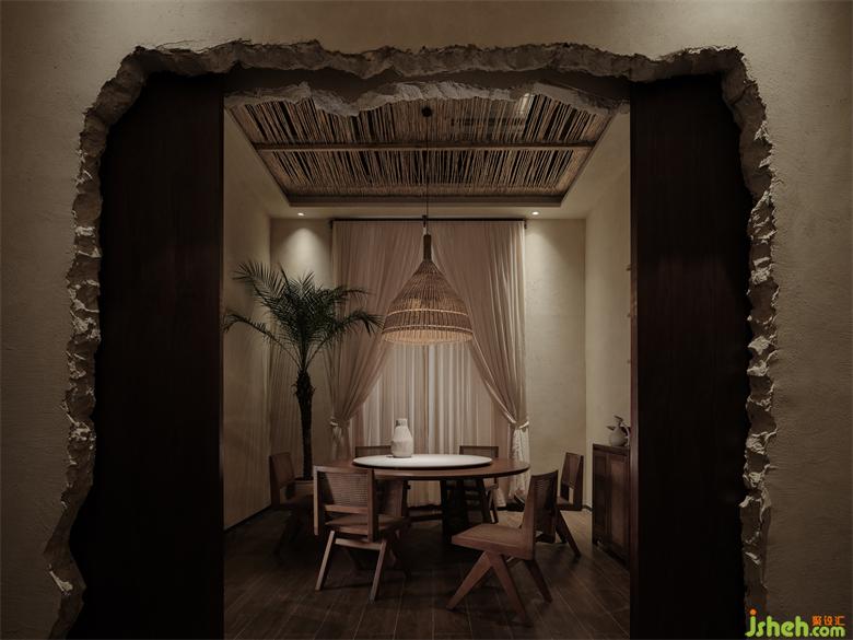 泰爽金Zapver海乐世界店,它既藏身于繁华城市之中,也藏身于大自然中。它既是饮食文化场域,也是心灵休憩之地。在这个空间之内,繁复的装饰材料被尽可能的去除,留下的是更耐得住时光打磨的东西:茅草、原木、石块、沙砾、藤蔓,这些源于自然的物质以另一种形式在空间内继续生长。