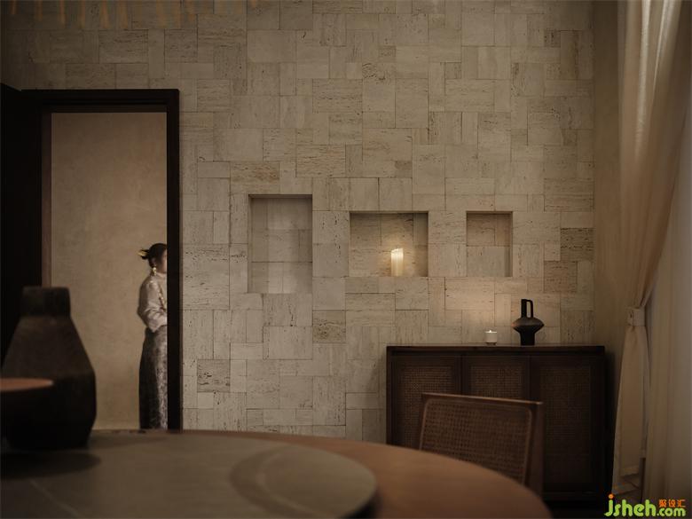包间内一边是肌理丰富的拼接石墙,一边是颗粒感十足的石板,在均匀的洗墙灯照射下,呈现出独特的光影纹理。