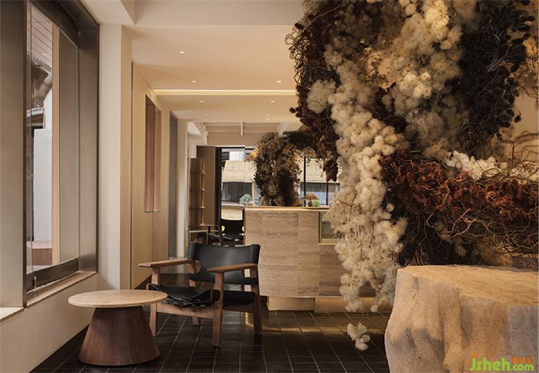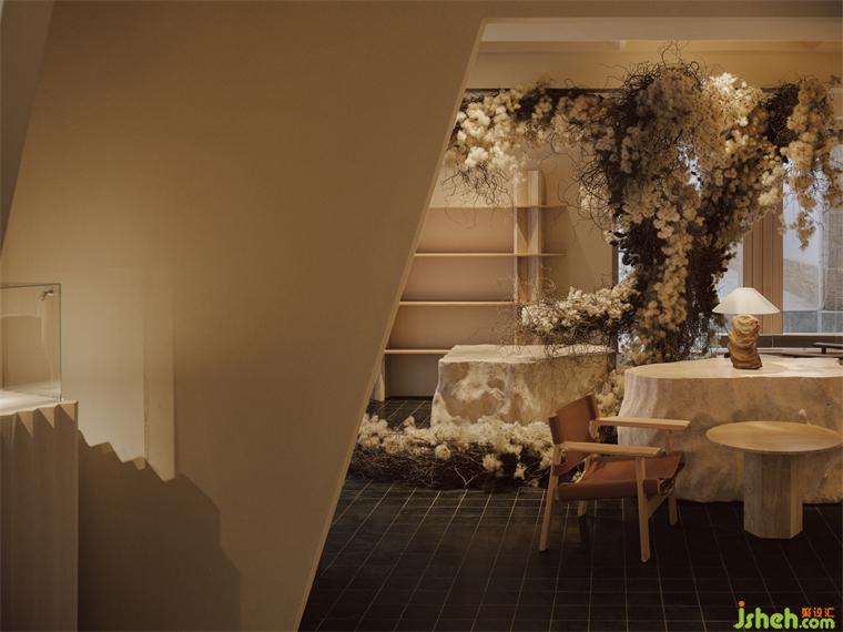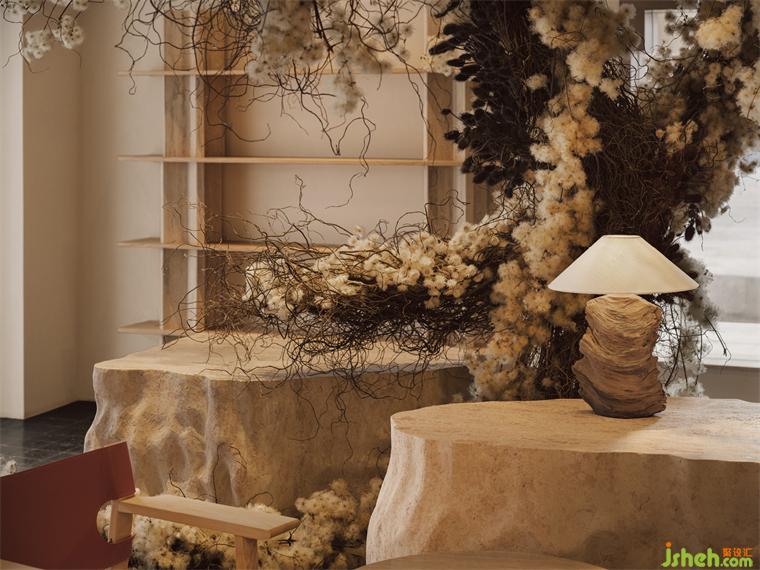由大型的艺术装置导入内部空间,让参观者在初入空间时就能感受整体的氛围,轻松而惬意,如沐春风,犹闻花香。装置灵感来自于旷野的大自然,盘根错节的植物根系。这些天然的元素被柔软地包裹着,蔓延着。转身而过,木质吧台温柔的栖息在你的周身,这里不止售出石头的艺术也贩卖美味的典藏。
