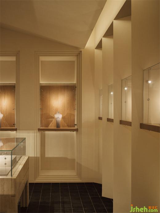 珠宝展厅设计不规则的天花造型和克制的灯光运用刻写出沉稳而静谧的时光气息。富于雕塑感的墙面造型,时而曲折锋利,时而规则理性,就像珠宝匠人们手中的刀具切割,设计师将其用于空间形态的刻画中,引导参观者的感官认知。