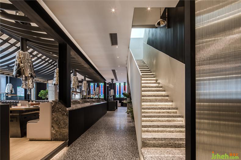 每一格的楼梯都散发出与室内空间色调相映的轮廓光,增添大大的仪式感。餐厅设计