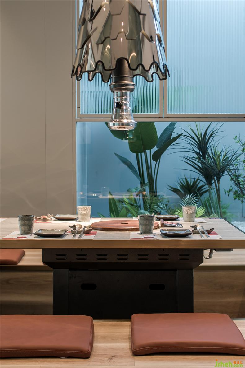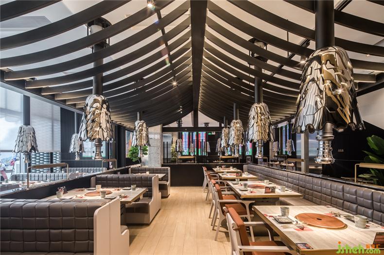 灯具外观与整体装饰保持一致,通过角度、功率、光束角的差异化处理,适度控制明暗对比去选择性的引导空间主次。结合金属板、屋面天花,照明干净利落。餐厅设计