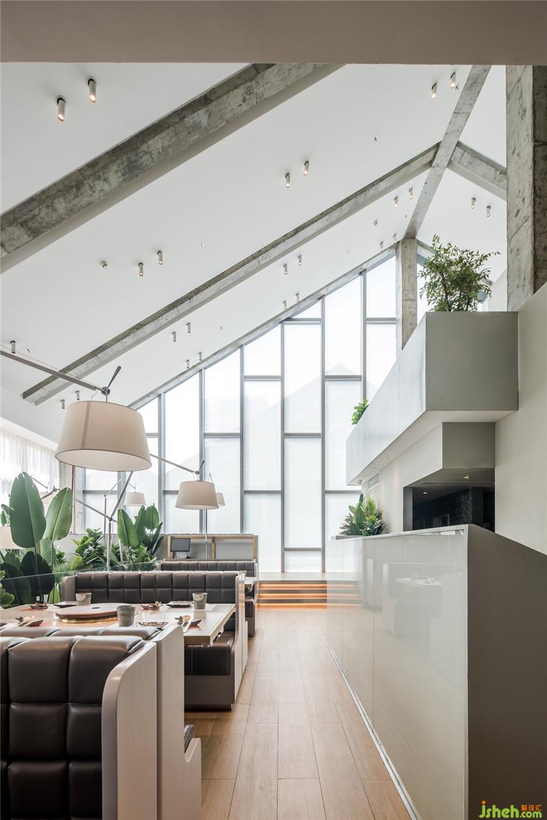 通过楼梯转角,步入二层,你会被二层的空间照明所震惊,与一楼较为浓厚的用餐氛围形成强烈对比,二层的灯光则依托于空间结构、以通透明亮的灯光色调为主,将整体建筑引入室内,最大程度地保留室外自然光进入室内,餐厅设计设定了项目的整体基调——悠然而至的静谧。