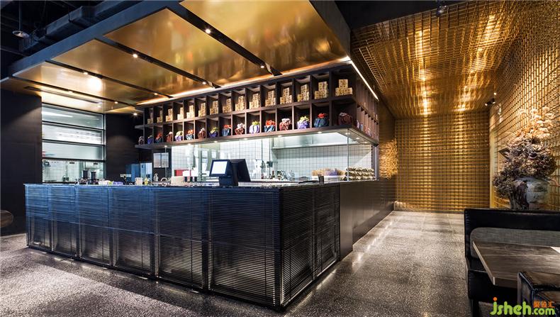 餐厅入口以及餐厅的收银台处,黄铜+深灰的材质配上暖调的灯光,营造出宾至如归的温馨感。