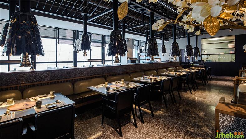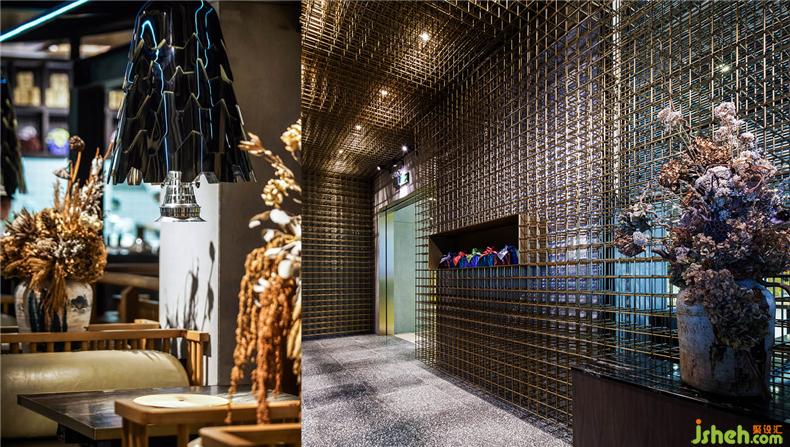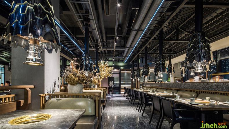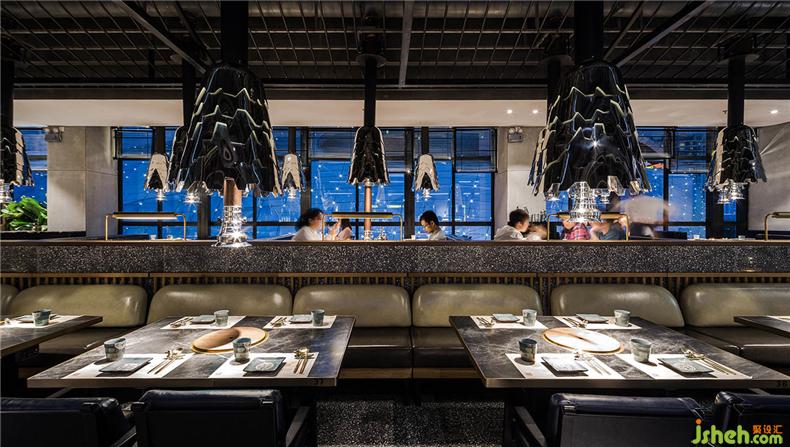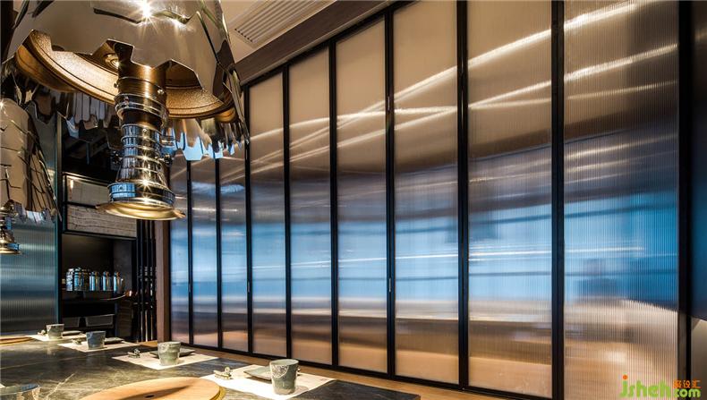 金属材质经灯光照明,高光、明暗、阴影变化无穷,餐厅设计这也是照明设计的奇妙之处。通过反射、折射,在不同角度;不同时段,表现出不同的面貌。突出空间的层次感和韵律感。