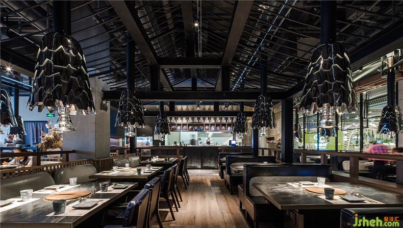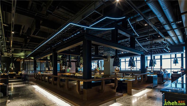 为了呼应这种室内空间效果,餐厅设计照明设计采用6000K柔性灯带强化结构拉大对比在建筑内部沿着结构延伸开来,强化了整个天花的造型感,突出材质的浑厚和隆重,让人犹如走进古老的东方街巷,体验文化的记忆和现代的摩登,让人不禁产生一种时空交错的魔幻感。
