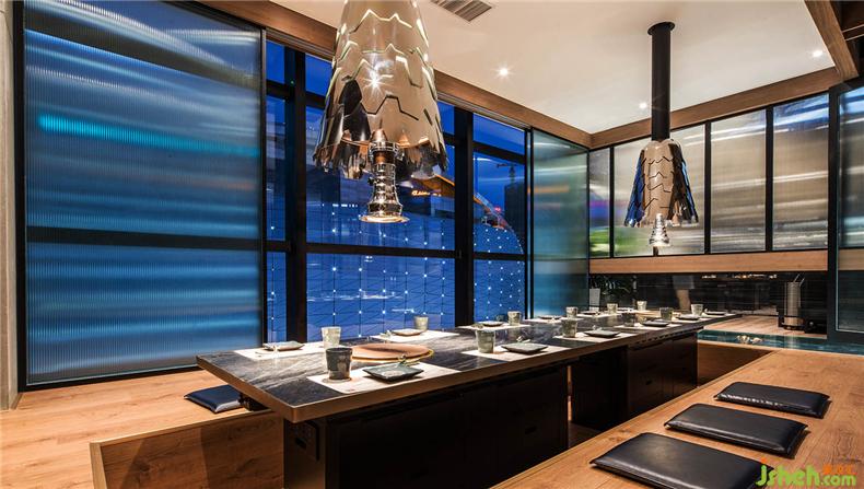 在用餐区域内,灯光特意强调桌面照明,餐厅设计弱化环境光,与空间色彩搭配,展现了空间的立体感及表现力。