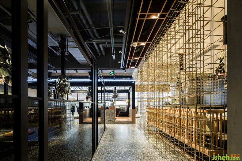 正门处的金属整列带来强烈的视觉冲击,灯光处理给了金属重构序列。安装在金属架上的射灯照射金属材质本质的同时,带来了明暗光影的变化。灯光引导了交织与交互,突破与重组使简单的几何图形让人在这里驻足。
