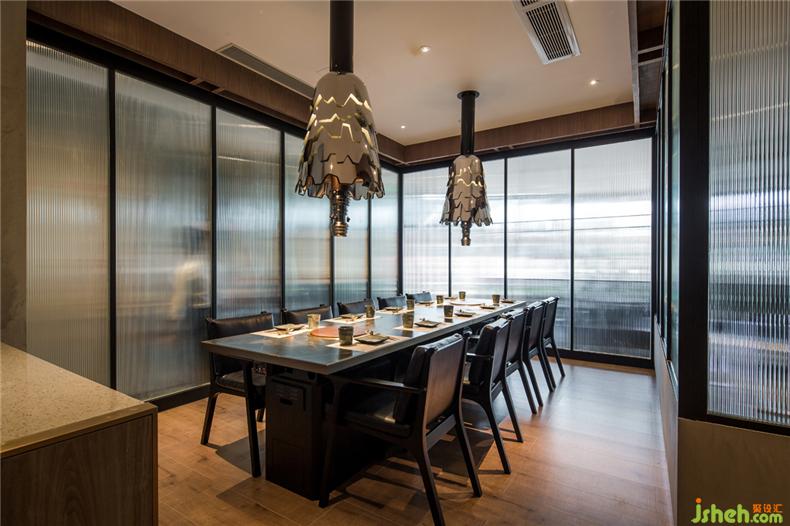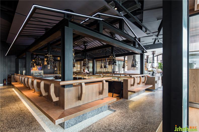 建筑形态表现淋漓尽致的开敞区,灯光设计则依据现场简约的空间氛围,与天花颜色一致的轨道灯隐藏在空间结构上,既满足空间照明需要又能很好的避免眩光,照明灯具融合成建筑结构的一部分。灯下面的射灯照桌面、烟罩内灯带做装饰表现、轨道射灯提供环境照明。在空间层次上相得益彰。