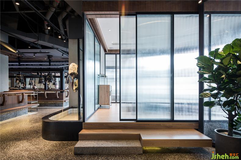 金属结构的重组划分空间层次,也在色彩上引导客户。简约的室内环境以灯光为装饰,但却能营造出极好的空间效果。