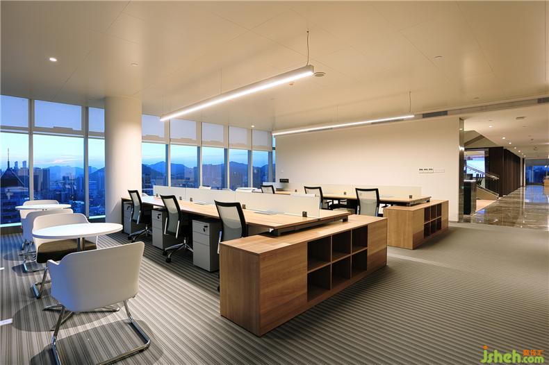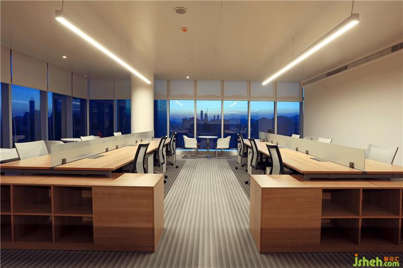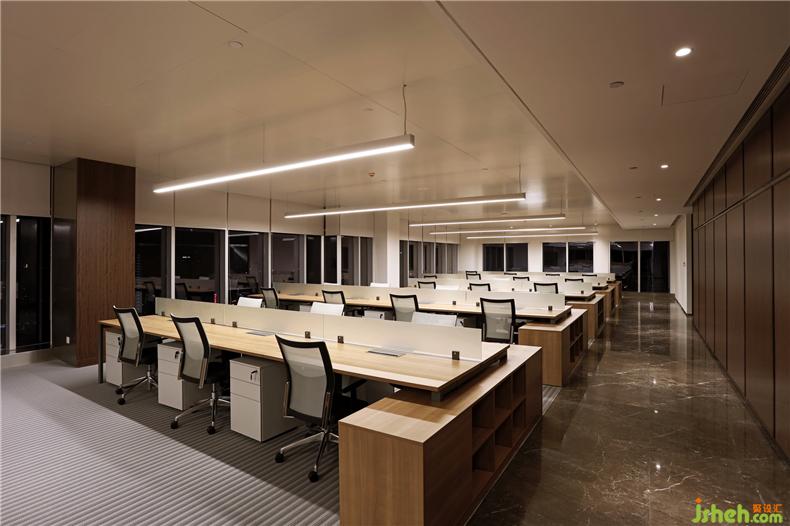 开敞办公区域既要让室内灯光符合办公照明的基本要求,办公室设计又想在环保节能的前提下,不落俗套。灯光设计师巧妙地利用智能窗帘与灯光互动达到室内光环境动态平衡,有效运用自然光去延伸室内空间的光环境。条形灯,离地高度2300左右,既能满足桌面要求,又不遮挡视线。若天花比较整洁的可以做上下发光。