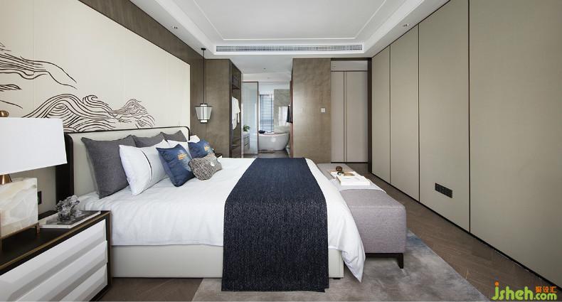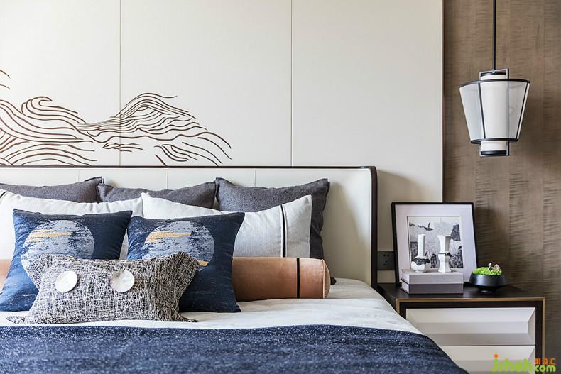 主卧床后屏风淡淡的墨痕,属于山水的抽象和淡雅。君子淡泊,不争不抢。室内设计师