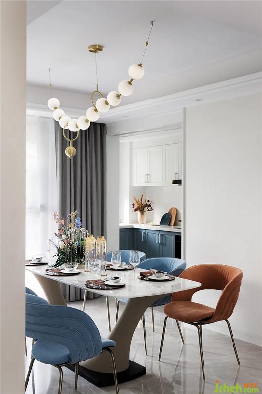 样板房设计师并没有用生硬的线条分割客餐厅区域,而是以一个矩形空间使人们的视觉自动划分开独特的餐厅一角,既保持了客餐厅一体的宽阔感,又使餐厅具备一定的私密性,家具的圆润增添了空间的高级感与流畅性,营造出静谧舒缓的居住氛围。