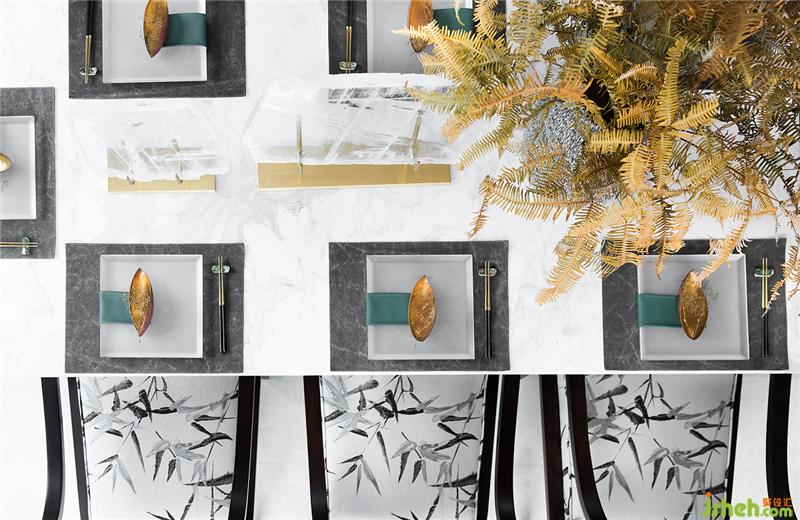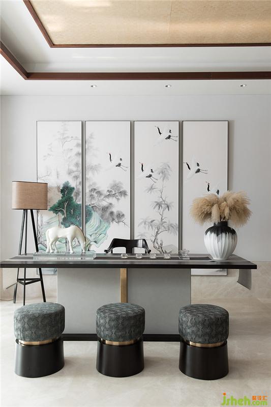 韦美在玄关和餐厅的处理上,大胆选择雅致水墨画来中和整个空间,用来打破过于繁琐的硬装造型所带来的沉闷。餐厅以当代美学格调的构图与铺陈,凸显设计笔触之下的意境之美。