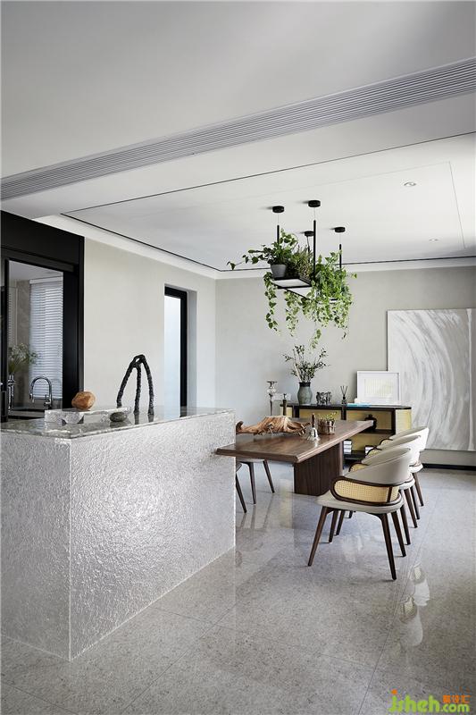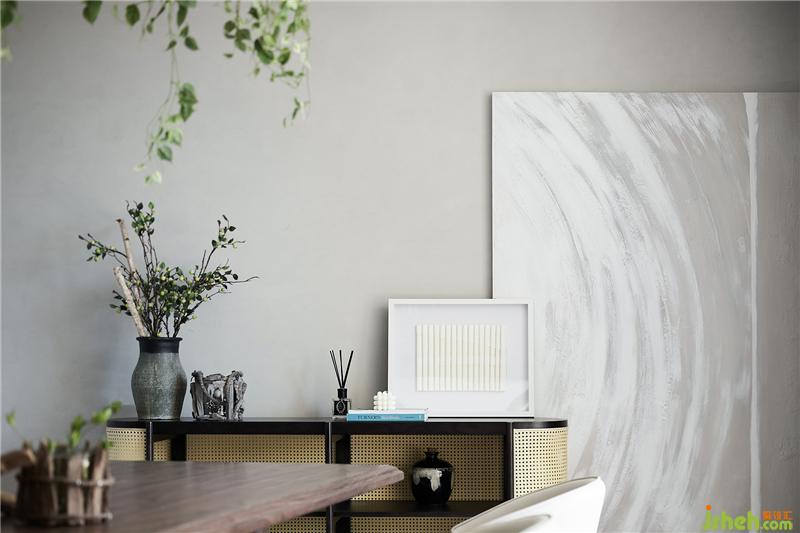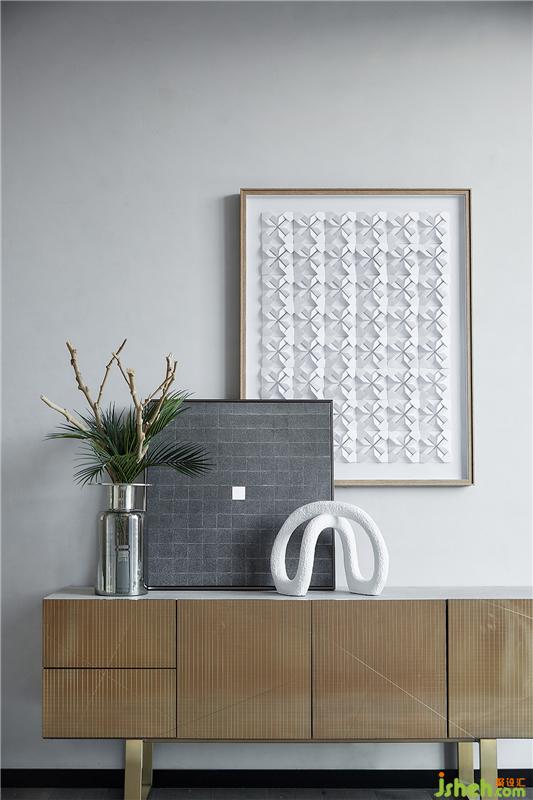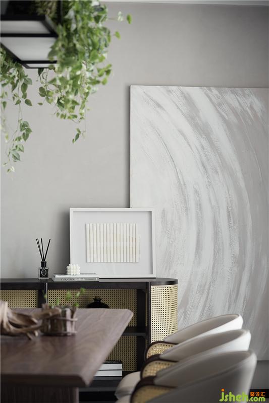 餐厅吊灯遵循了绿色环保理念,在保留其基本功能性的同时氧化生活。餐厅在建筑格局上有一堵斜墙,设计师在酒柜选型上采用了轻巧的弧形矮柜化解斜墙尖角,大幅挂画在留白的基础上填充空间,让原本棘手的空间格局变得生动有趣。