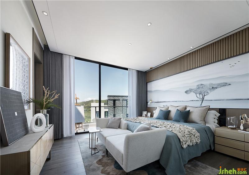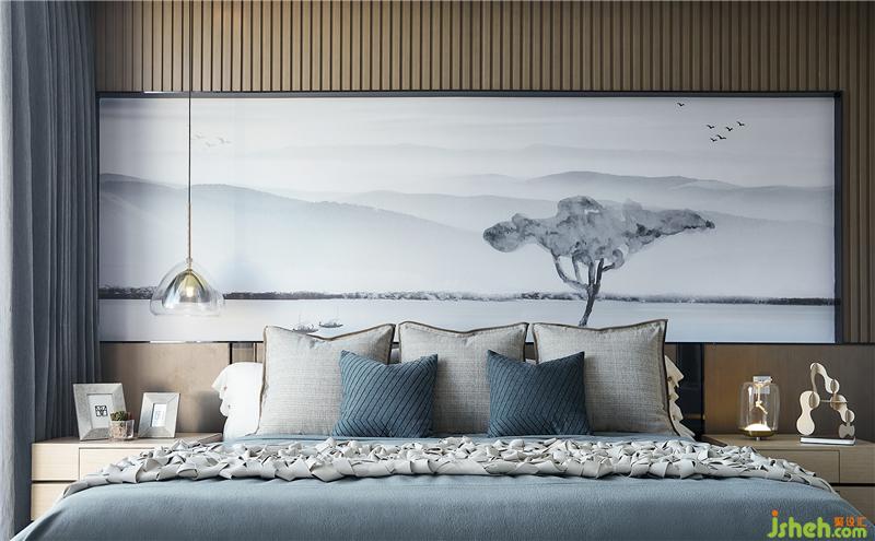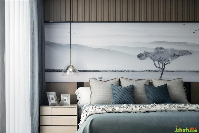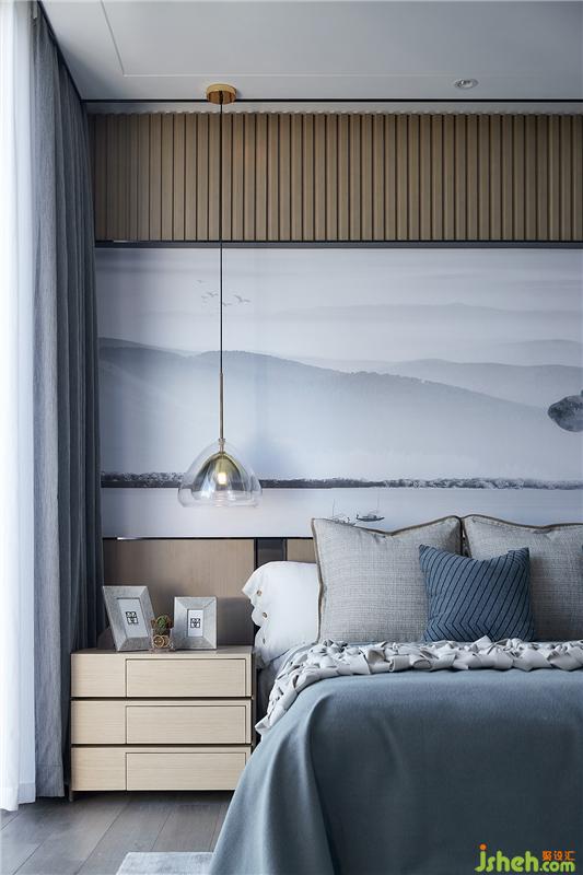木质的床头硬装背景造型融入自然元素的软装拉伸空间尺度,天蓝色的棉麻织为床品,植物转化而成的纸张制成挂画,石膏土糅合成艺术品,这一切自然可再生的元素无不在传达一个绿色生态的居所理念,让空间变得纯粹而干净。