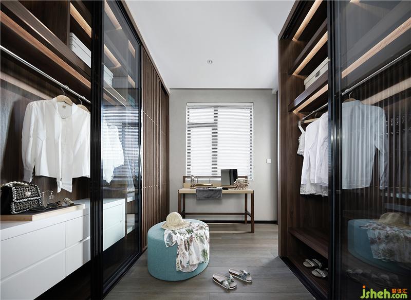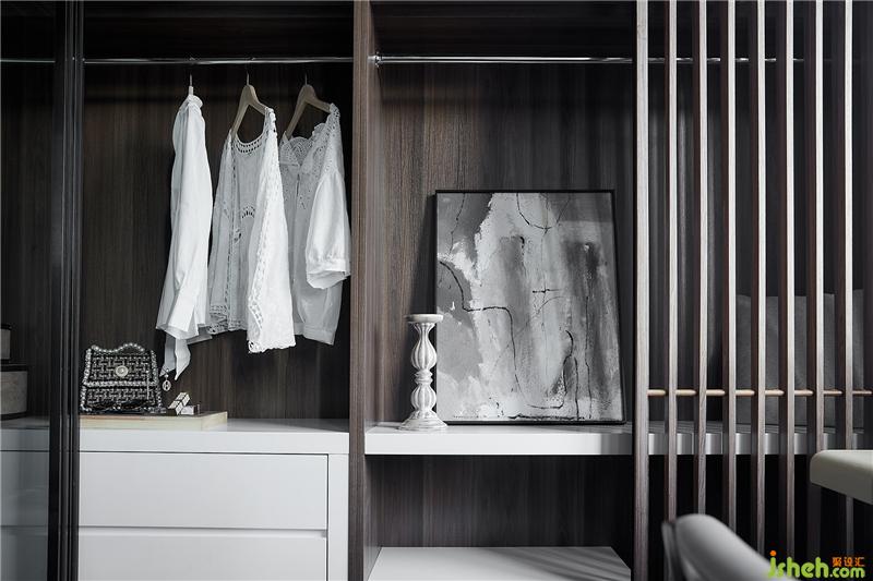 步入式衣帽间以古木格栅与清玻自然衔接,加以面料棉麻润泽,让自然增添几分人类存在的痕迹。有一种徜徉在自然的感觉,淳朴而具有亲和力。