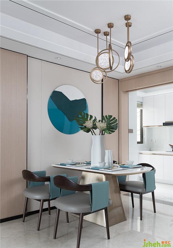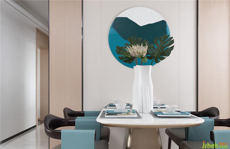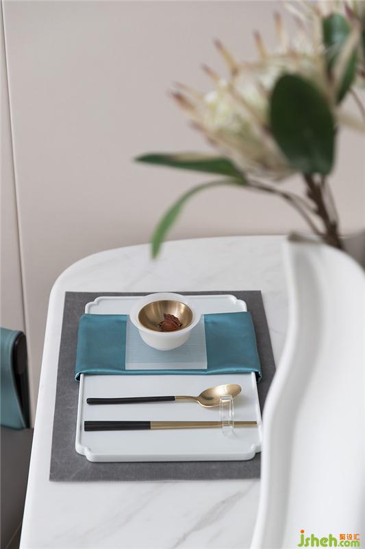 餐厅与客厅相通相融,清风穿堂而过,吹皱画上春水。家具选择合适的体量与舒缓的造型。浅色石材与深色皮革,加之空间原有的温润木质,餐厅在韦美设计师的手下勾勒下宁静而淡泊。