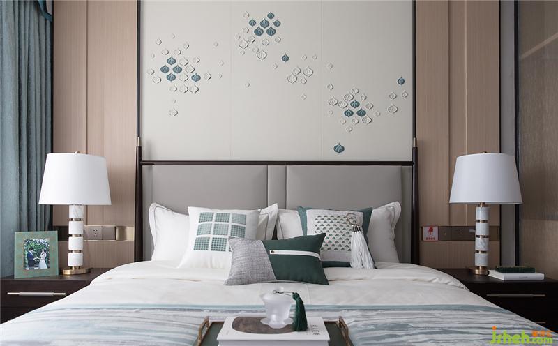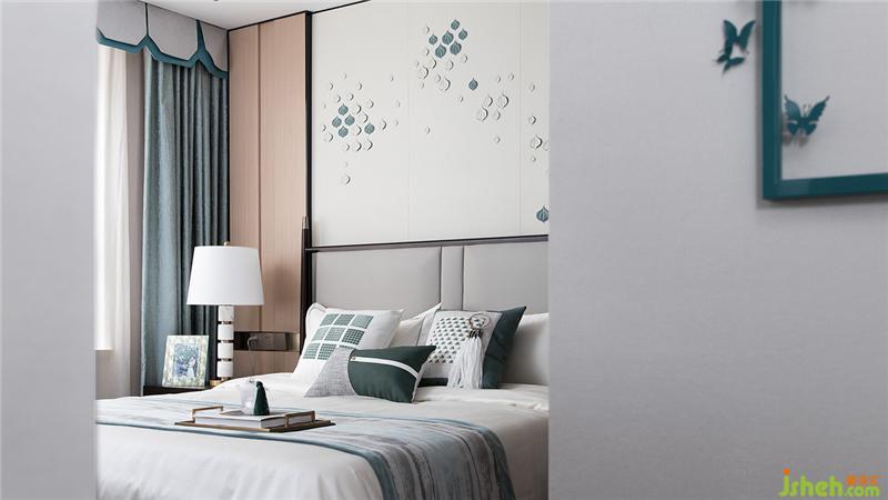 主卧屏风带着点点春色,烟雨初歇,留白间是“草色遥看近却无”的意境。浅浅花草间有蝴蝶乘风而来,家具选款沉静大气。