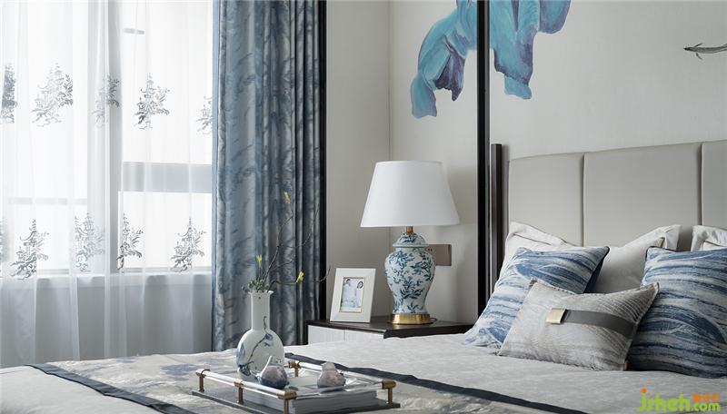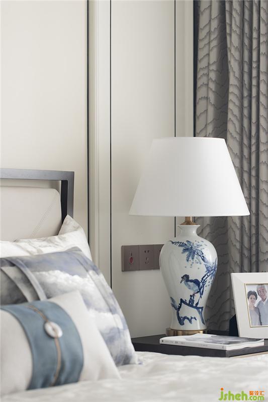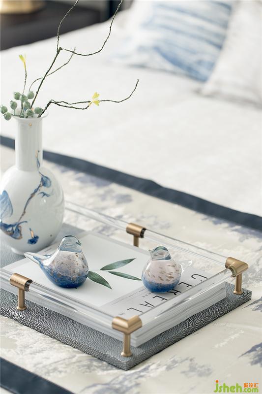 清代青花,历经元、明两代后,洗尽铅华,古朴精巧。长辈房的设计以朴实为主要基调,家具陈设干净简练,装饰品上体现清青花“青分五色“的多样化细节,丰富祥和。