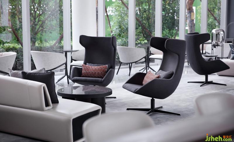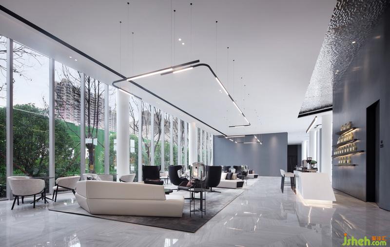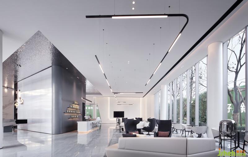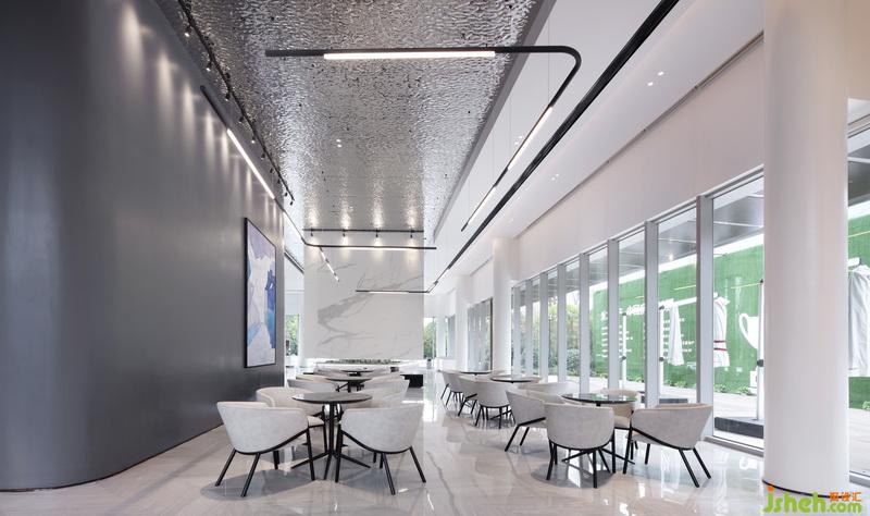 极简主义不只是一种手法,更是一种生活的态度。设计师把洽谈区置放于自然之中,充分利用线性元素的衔接与景观体块两者相互交融。使用独特的U型阳光板物料,运用框景、借景等造景方式,搭配天花覆盖的大面积水波纹板,灵动的水景,开阔的草坪,延展出不一样的风景。