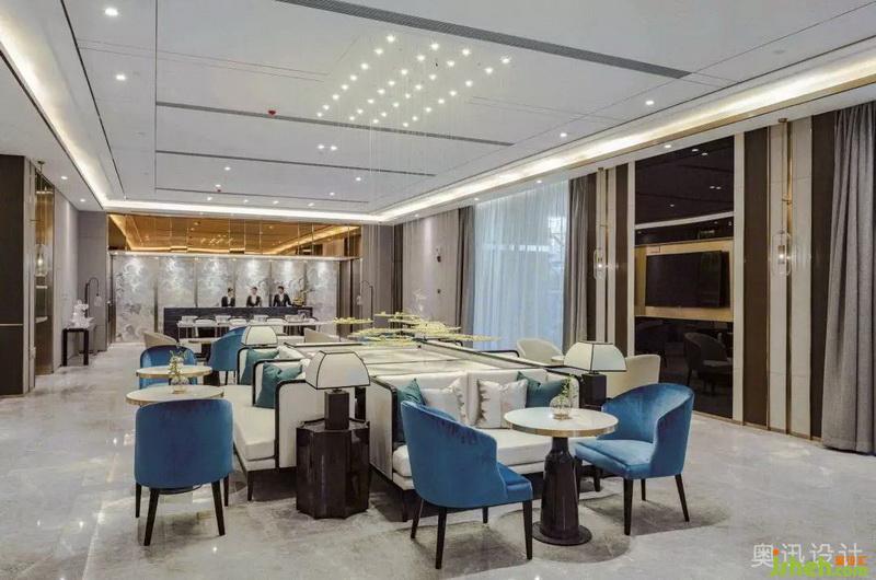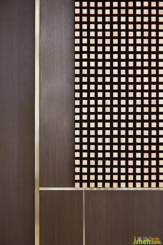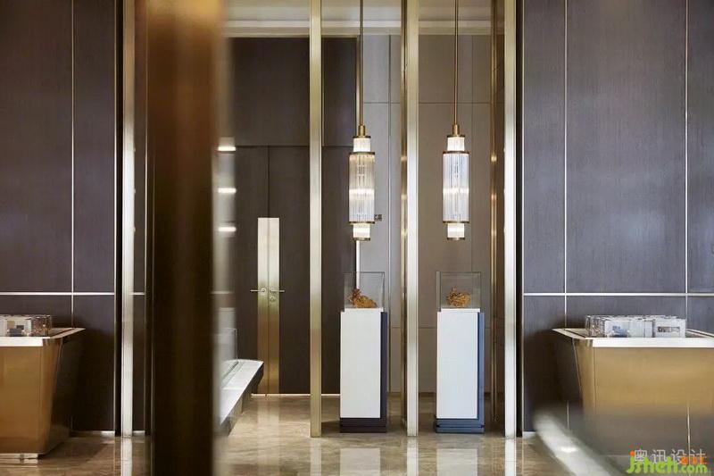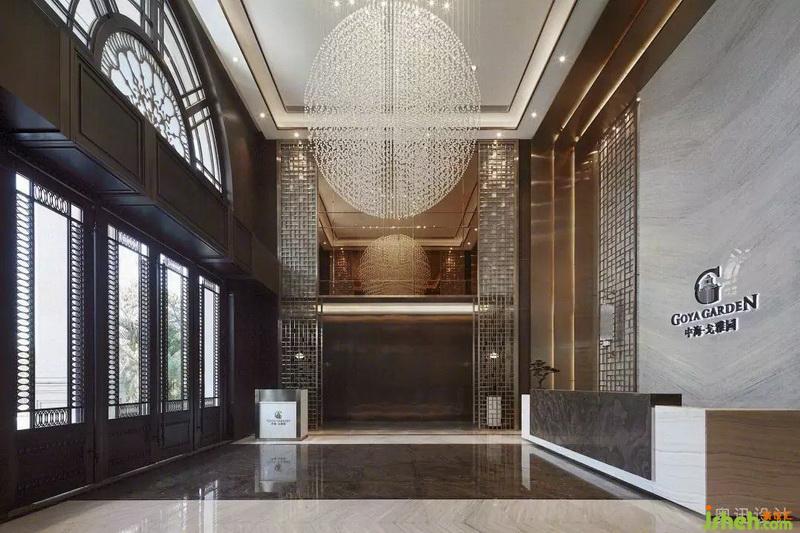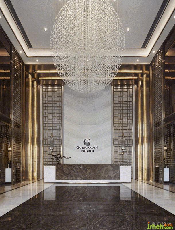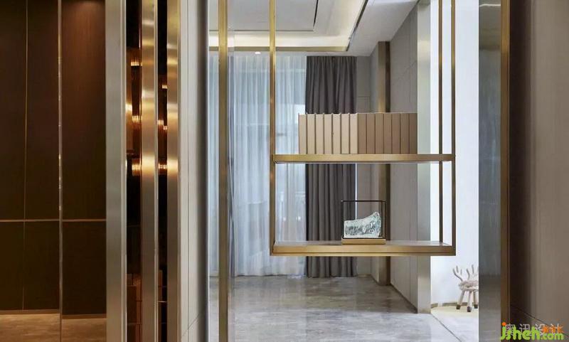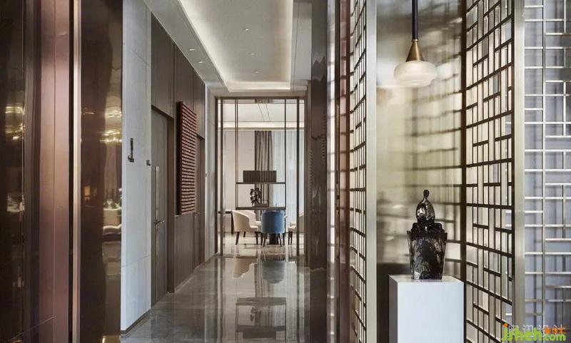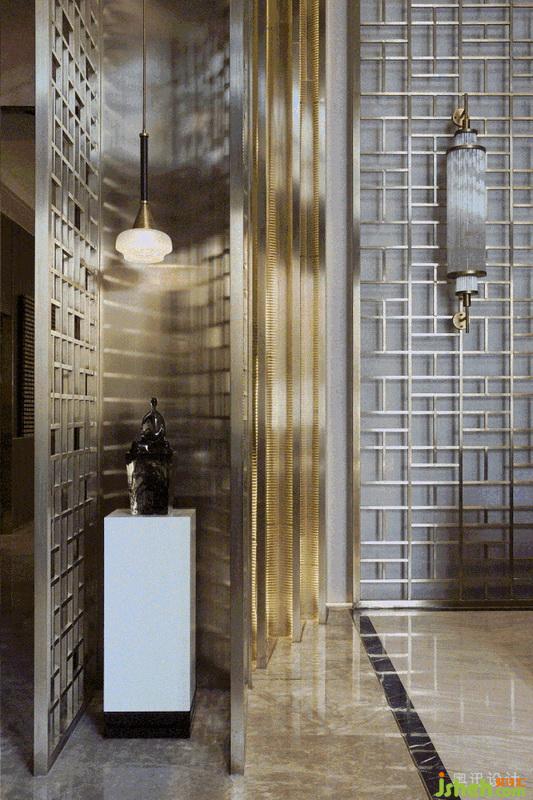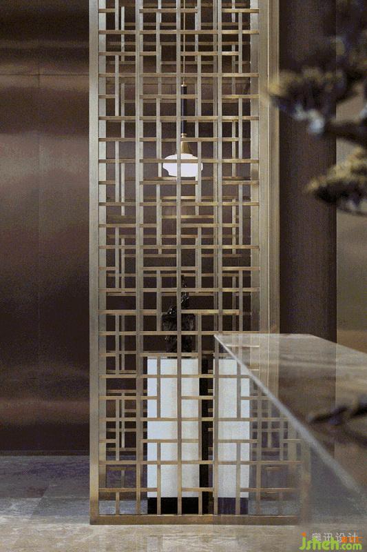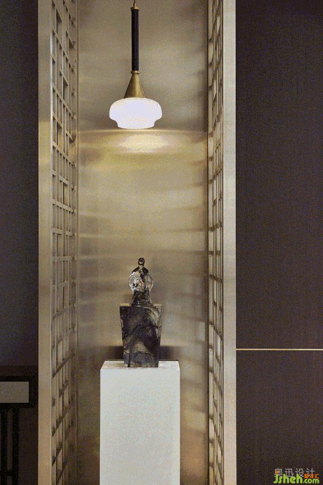 设计师在接待大厅上方以纵横交错的水晶吊灯,企图烘托周边环境的清雅。在光的作用下,似山的叠嶂,似水的柔美,与奈高斯白木纹石的背景墙、奥巴马木纹石拼花的地面相互呼应,呈现出飘渺山水的灵动逸致。简约的艺术摆件,淡化传统文化符号的印象,独具质感的不锈钢镂空屏风和各空间以一种成熟而收敛的方式相互渗透,端庄丰华中透着柔情。