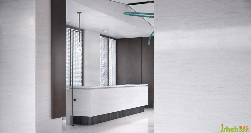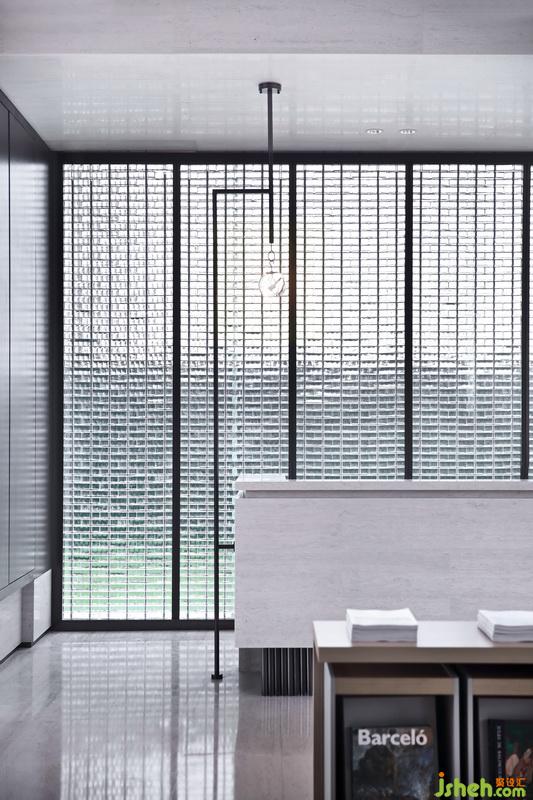 波光粼粼的玻璃砖墙面让人想起赣江的秀丽景色,呼应了蓝色水系艺术装置。拉丝香槟金在灰色、白色墙体中跳跃其间,唤醒了空间活力。