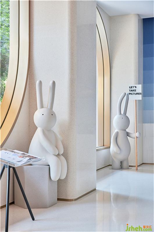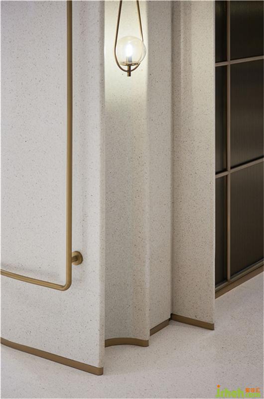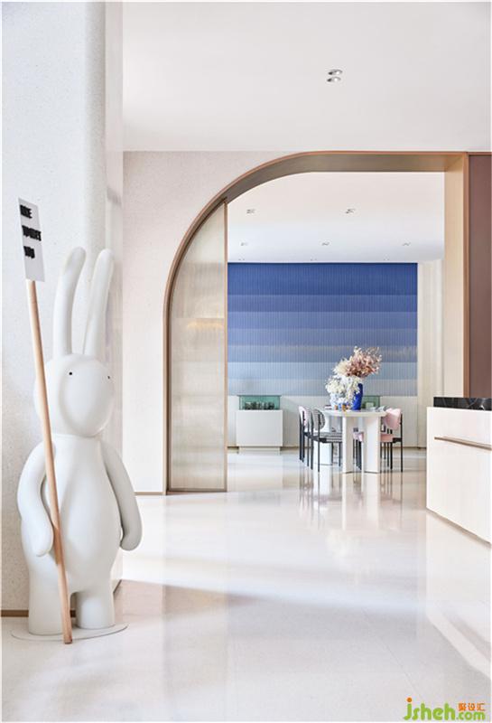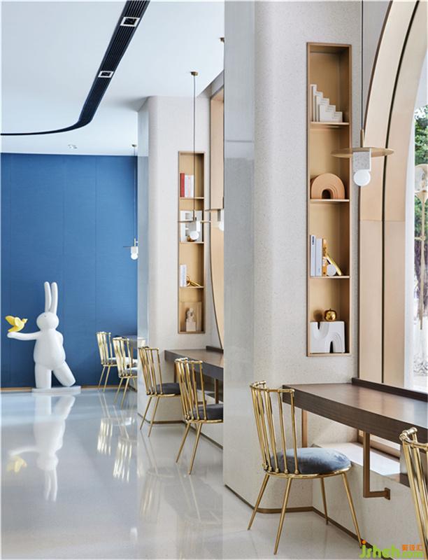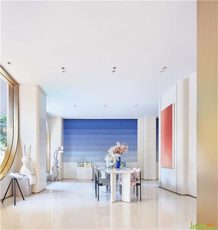 临街的座位借助金属线条和幻彩玻璃的光学性能,打造的连续曲面景墙,营造出梦幻色彩的沿街展示面,一方面以柔美的曲线来进行设计语言表达,引导着人们开启奇幻梦中之旅。另一方面,在白色极简的基础上,利用门店全景观视野,打开了室内与室外清晰共话。
