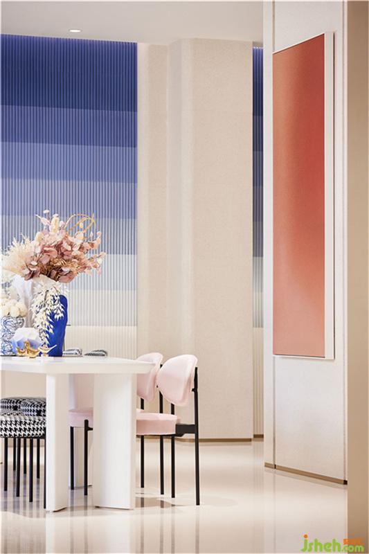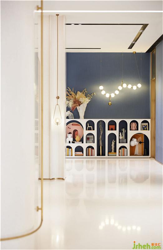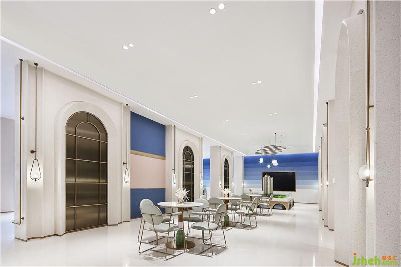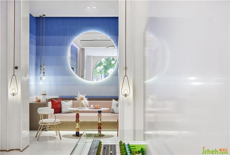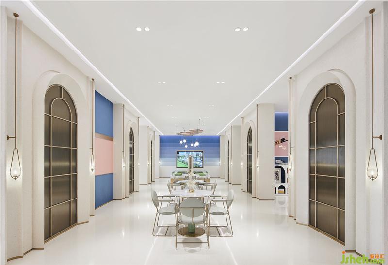 自然界中有形的东西是流动的,但是构成这些有形物质的“形式”或“理念”却是永恒不变的。在前厅中,设计师引入“兔子精灵IP”建造入口处景观,加以“伊甸园的果粉与黛蓝”氛围营造,形成与顾客良好的步入体验,串联起童话梦幻场景,演绎一幅无限贴近主题的艺术速写。