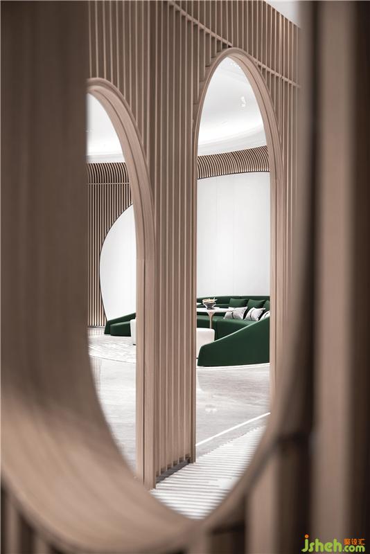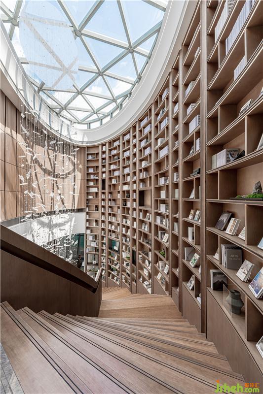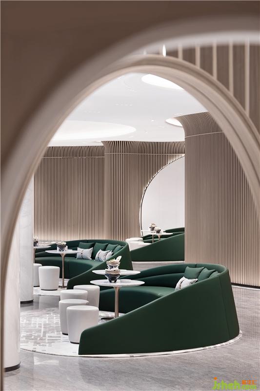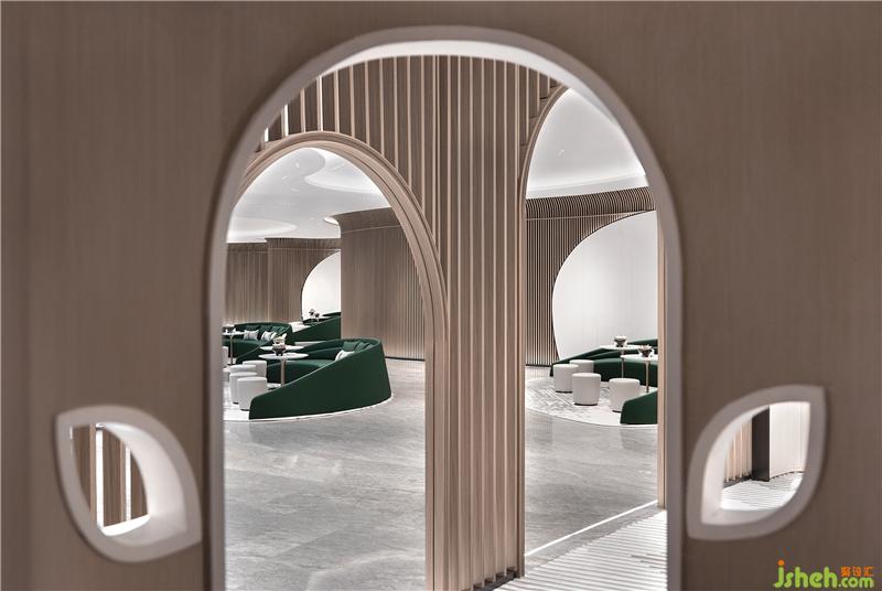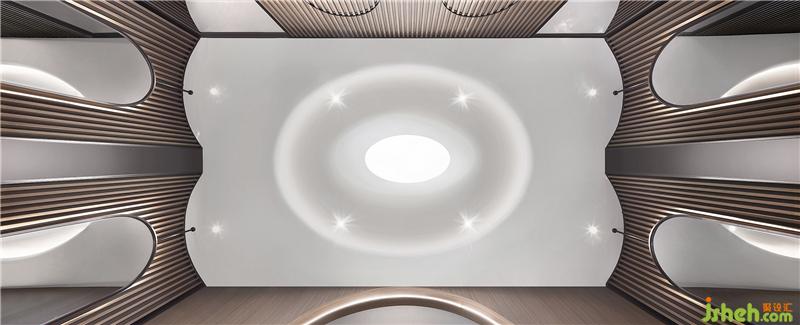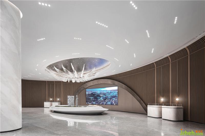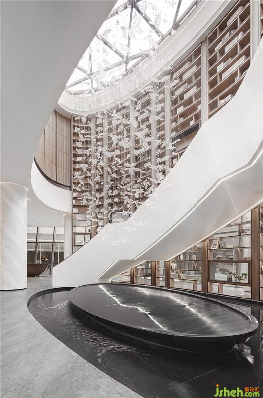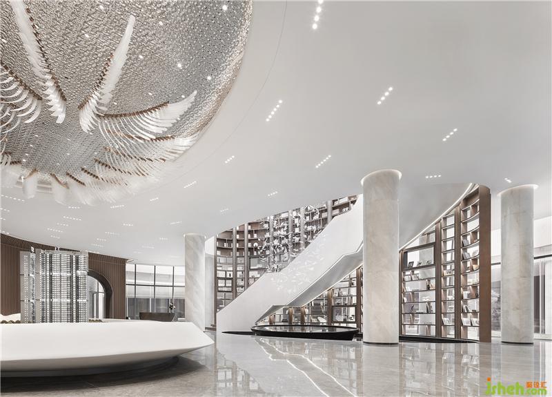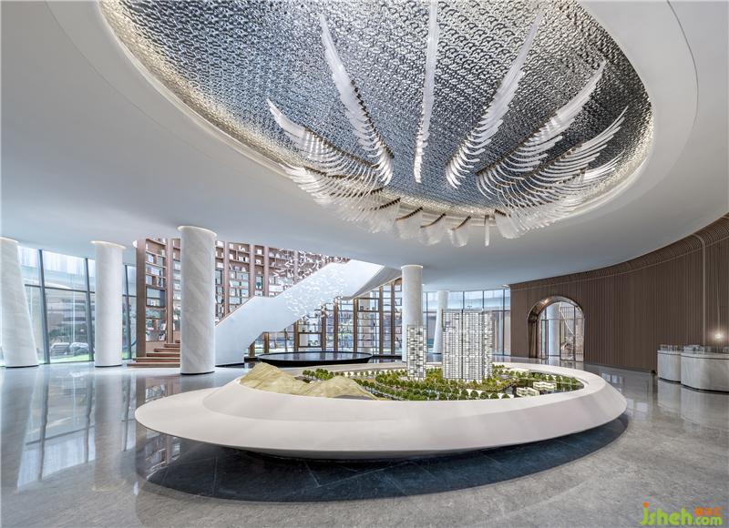 曲线艺术与自然生态相融,勾勒空间的起承转合。设计融入黎曼几何的不规则流畅线条,引入《翼》的艺术装置,寓意翱翔天际,展翅未来。