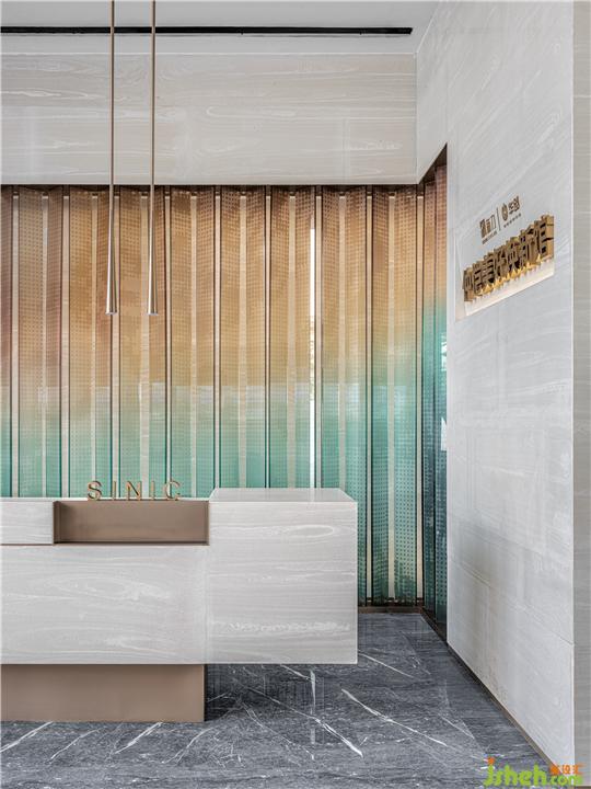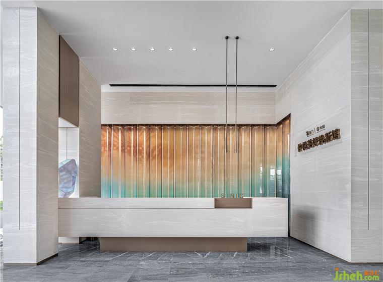 走进接待大厅,秉着定制化记忆符号带来强烈的感官体验,将设计的想象力通过科技带入到未来的生活憧憬当中。借用蝴蝶双翼幻化为造型屏风,以蓝橙渐变色彩为媒介,似乎打破沉静的场域氛围,暗喻着这城市如旭日初生的般美好。
