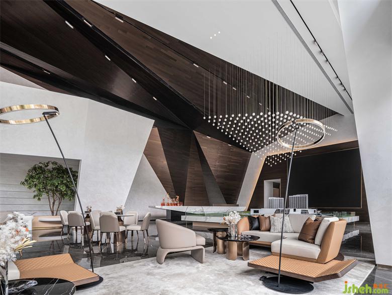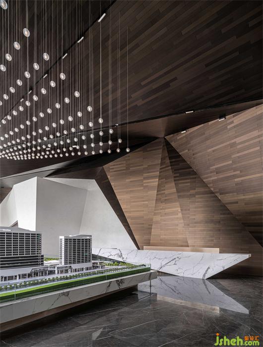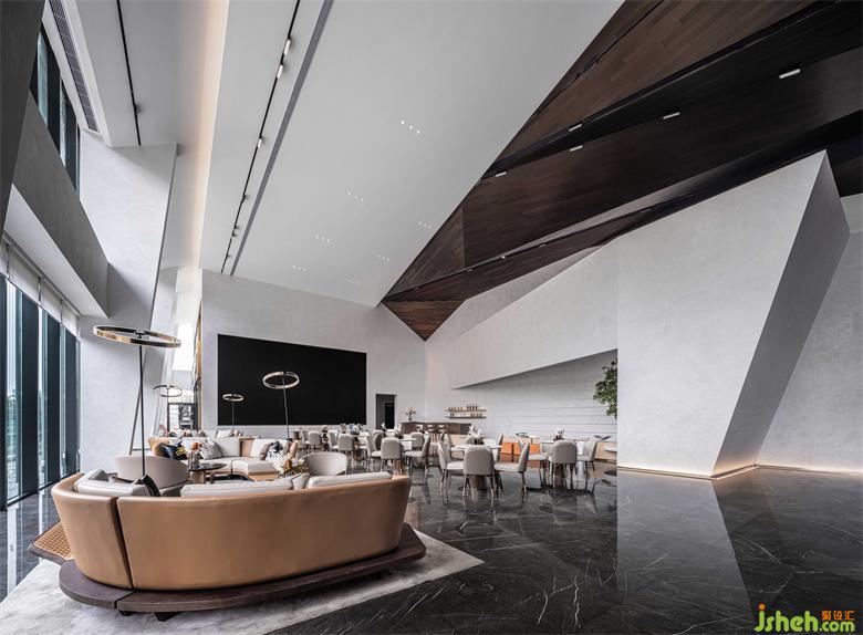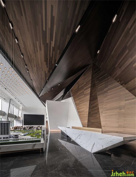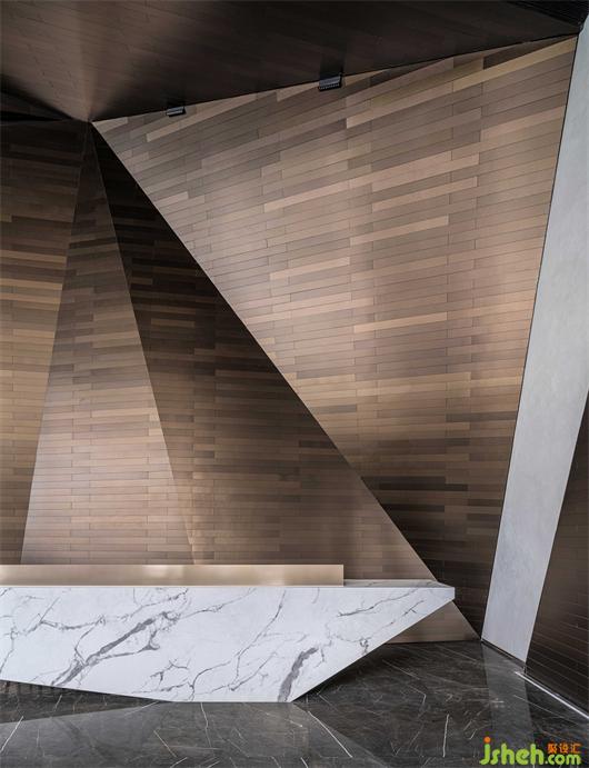 接待大厅以镜面不锈钢与几何金属防火板的碰撞融合,构成空间的多维度群山造型呈现。沉稳的大理石在广博的纹理中,嵌入黑金渐变的色调,婉若天空微亮前的山峦金顶,使观者置身其中,产生对历史记忆的共鸣。