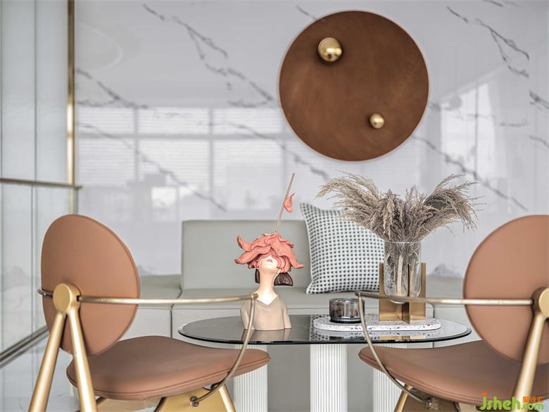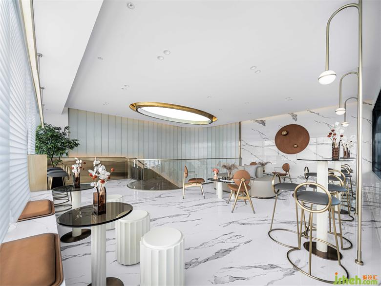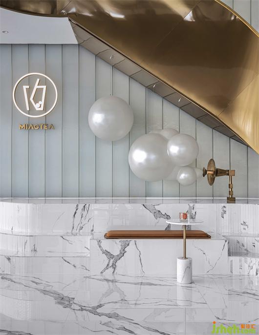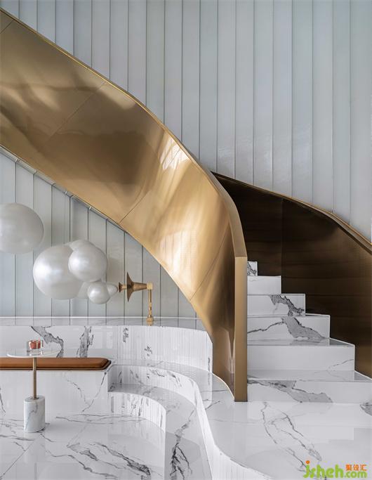 售楼处设计取自于“太行灵秀,漳河浩荡”氛围渲染,设计师把太行山秋日金黄的色调萦绕整个空间,麦垛状的极简餐椅安置在黑白纹理的瓷砖上,以梦幻泡泡装置与人们交互,形成舒适和谐的视觉效果。
