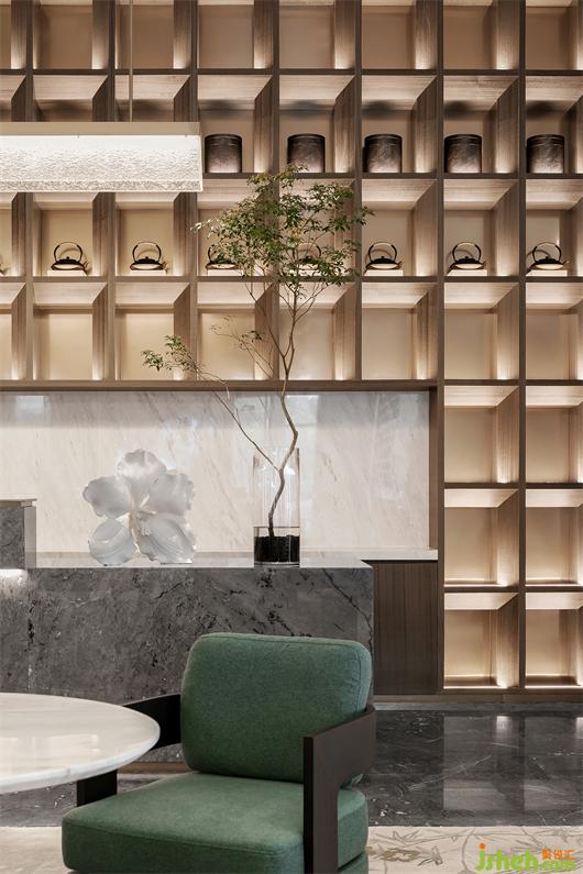 依岭南儒雅文化为特点,结合售楼部设计的情景模式的功能需求,通高的镂空方形石材盒子组成幕墙,透过自然光影的辉映,以无限的静默将室内外的界限完全打破,无限延伸可视域范围,城景合一,建景相融的场所精神。后场以礼序为形,呈现中国五进归家之礼,层层递进,雅趣横生。