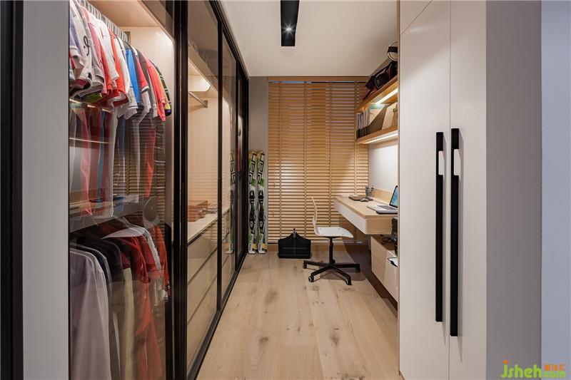 别有一番天地的衣帽间内部,特地设计了一个低调安静的独处空间。当初我们在界定每个功能属性时,其实并未强调明确的划分,而是随着男主人的心境来随意切换空间的使用状态,显露出空间的最终目的,一直都是为人享用的这一概念。