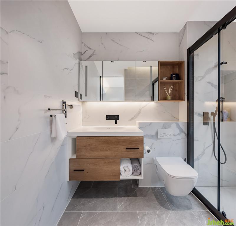 在黑色滑动门背后是一个纯净的客卫,材质的选用,是对于原始形态的推崇,加上精密打磨,表现出冷静、光滑的独特肌理,看似冰凉,却极易牵动情思。值得一提的是,整个空间并没有单独设置公共卫生间,而是将两间卧室都当做套房处理,一方面是对客人的温柔关照,另一方面,是向往自由随性、与万物和谐共处的生活映照。