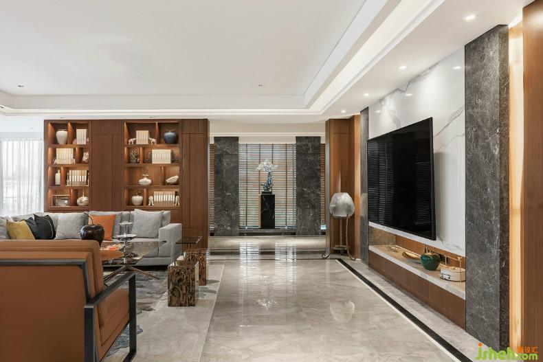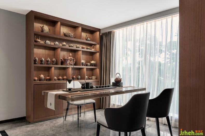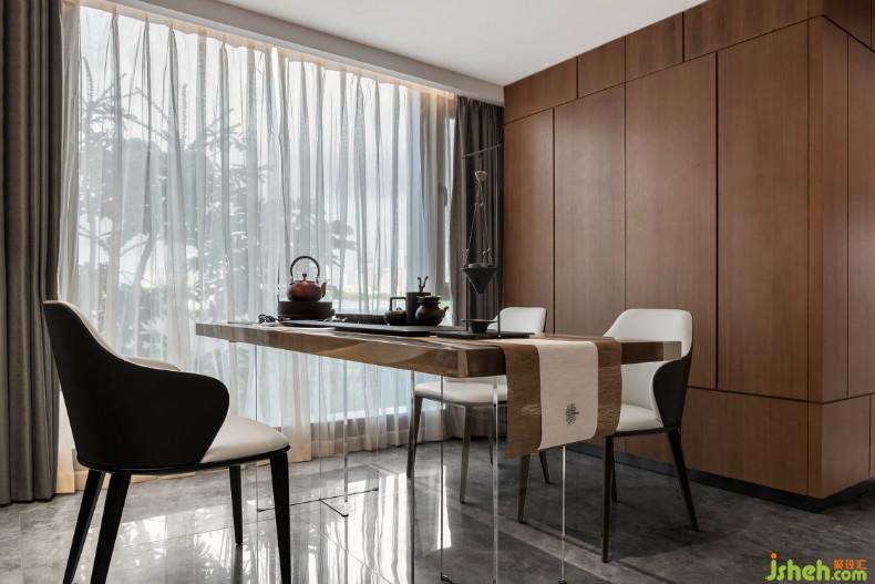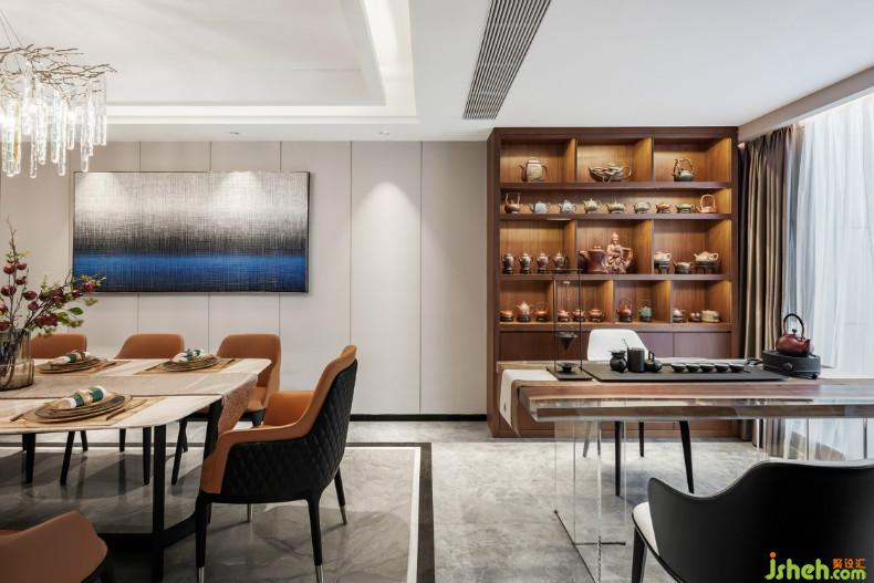 空间划分过程中,各功能区呈递进式布局。开放式客厅、餐厅、茶室、休闲区、吧台都被容纳到同一个生活场景;室内设计师以及利用木墙隔断将茶室、休闲区间隔开,视觉上形成“一室多用,互不干扰”的效果,同时维系各个功能区域的秩序,增强空间层次感。