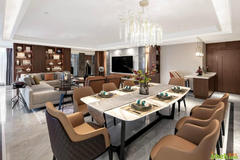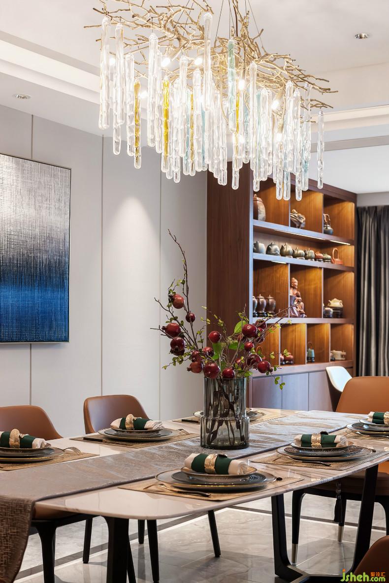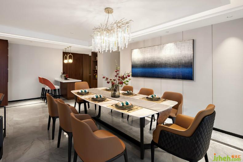 餐厅设计为避免视觉杂乱,只保留了清晰素净的元素。室内设计师艺术灯饰与背景墙画在简约气质下,给人宁静安逸的质感。