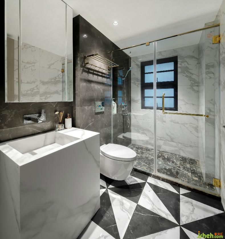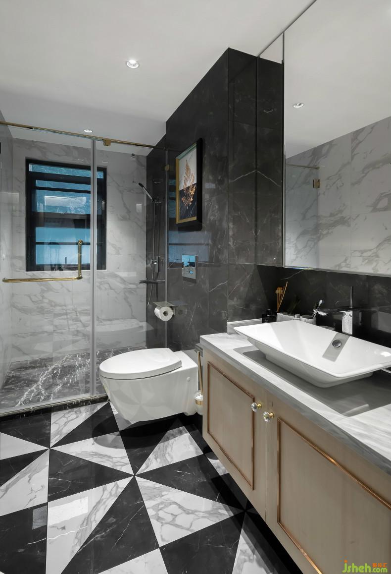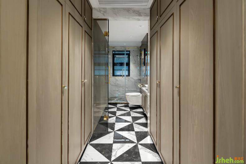 主卫在这个空间中的设计风格显得摩登而时尚感十足,几何艺术地板与大理石所构成的简约奢华,将主人对于追求品质生活的向往提升到了另一层高度。室内设计师设计格局上,主卧行至衣帽间,再到主卫的路径设置,为生活塑造了一种精致的仪式感。