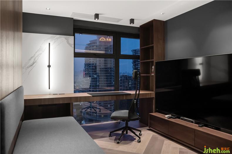 空间氛围营造上,设计并未穿插过多艺术品凸显空间艺术气息,室内设计师而是利用造型解构与重组,让光影来说话。例如活动区、主卧、小孩房门口等摆置在墙面上的个性极简条形灯,都有着别样的感性艺术。