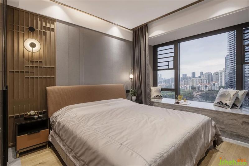 “静听四季诗吟,坐看云舒云卷”主卧在风格上承接了设计的东方主题,但更加独立且幽静,仿佛是城市中的一舍隐居,形式上也更深沉富有质感。
