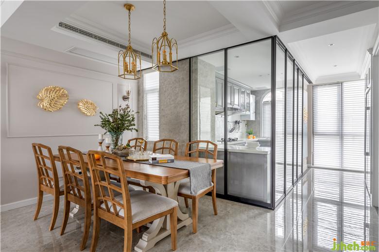 一层的纵深很大,原户型实墙阻隔了来自厨房的光线,使得位于中部的餐厅陷入暗淡无光的困境。因此室内设计师采用多联动玻璃移门,让两边的阳光成功牵手,整个家也变得通透起来。
