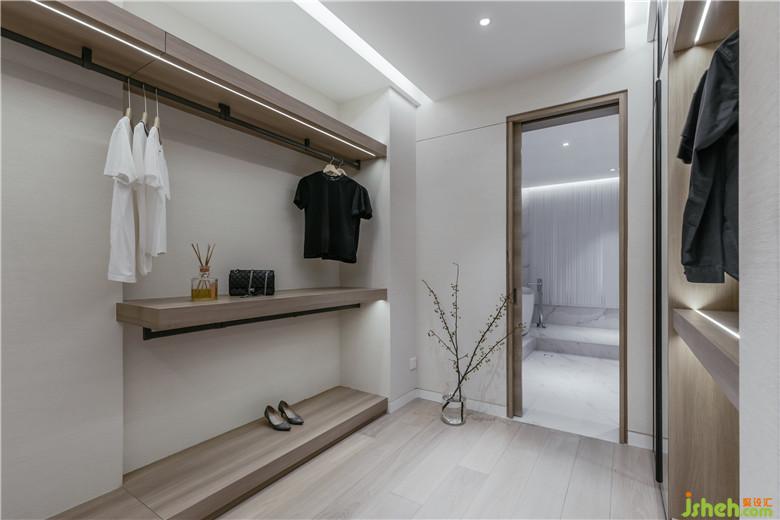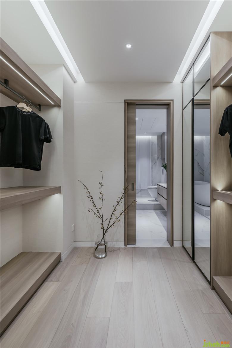 三恒设备让家里可以无忧地拥有开放式超大衣帽间。顶面线性&点光源、层板内嵌灯条的设计,开放与封闭结合。纯色黑白灰衣物、鞋包挂放在这里,井井有条,干练利落,构成了属于主人的空间秩序,创造生活品质。