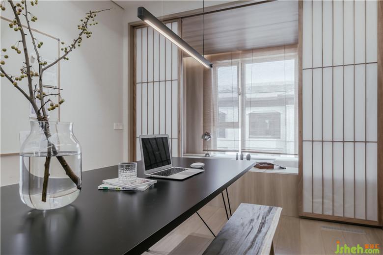 书房,兼具主人的工作区、家庭休闲区、榻榻米收纳区。柔和的木质与白色,带来一股淡淡的禅意韵味。格栅移门适时遮挡,环境放松,心更平和。当移门完全拉上,这里也能充当临时客房使用。