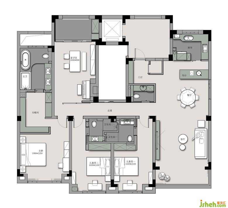 每个房间都设计成配备独立卫生间的套房,让家庭小成员也能拥有各自的私密空间。