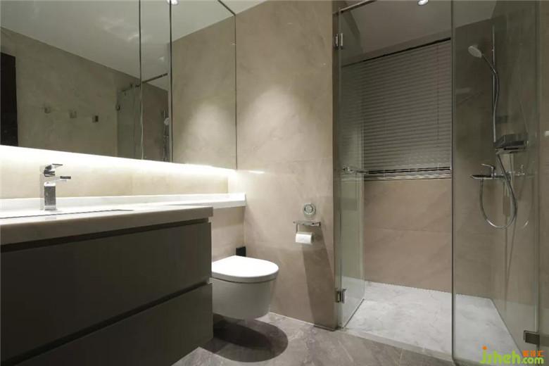 卫浴部分的大理石花纹地板符合现代风格的简约大气,玻璃门的设计很好的隔开水雾,做到干湿分离,玻璃梳妆台则是壹个暗藏收纳柜,打开可以放置洗浴用品,这种设计方便又时尚。