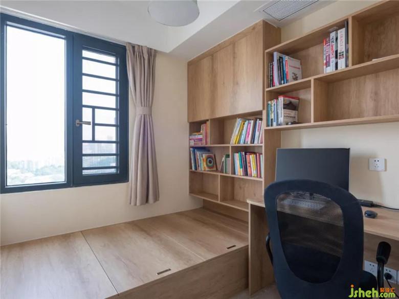 榻榻米房间,延续了简洁大方的特点,具有收纳的功能,同时也是一间书房。男业主经常国内外出差,有时候还需要到家里办公,设计师根据业主的诉求,定制设计了收纳和书架相结合的榻榻米柜子,满足了现下家庭居住和办公需要。